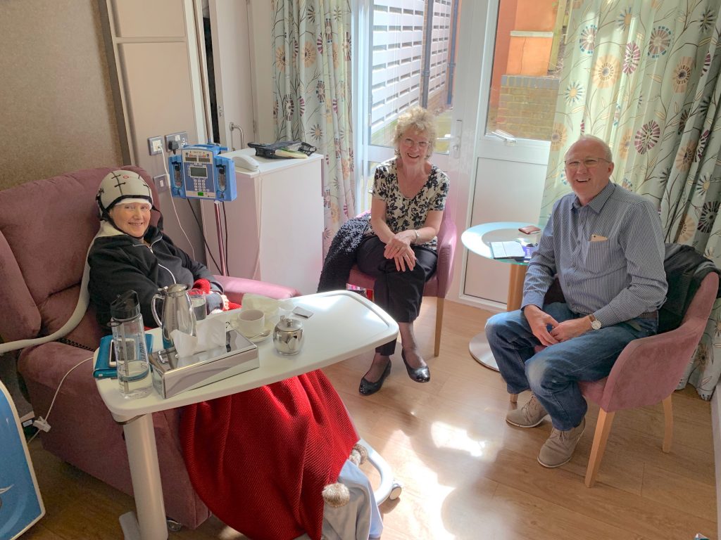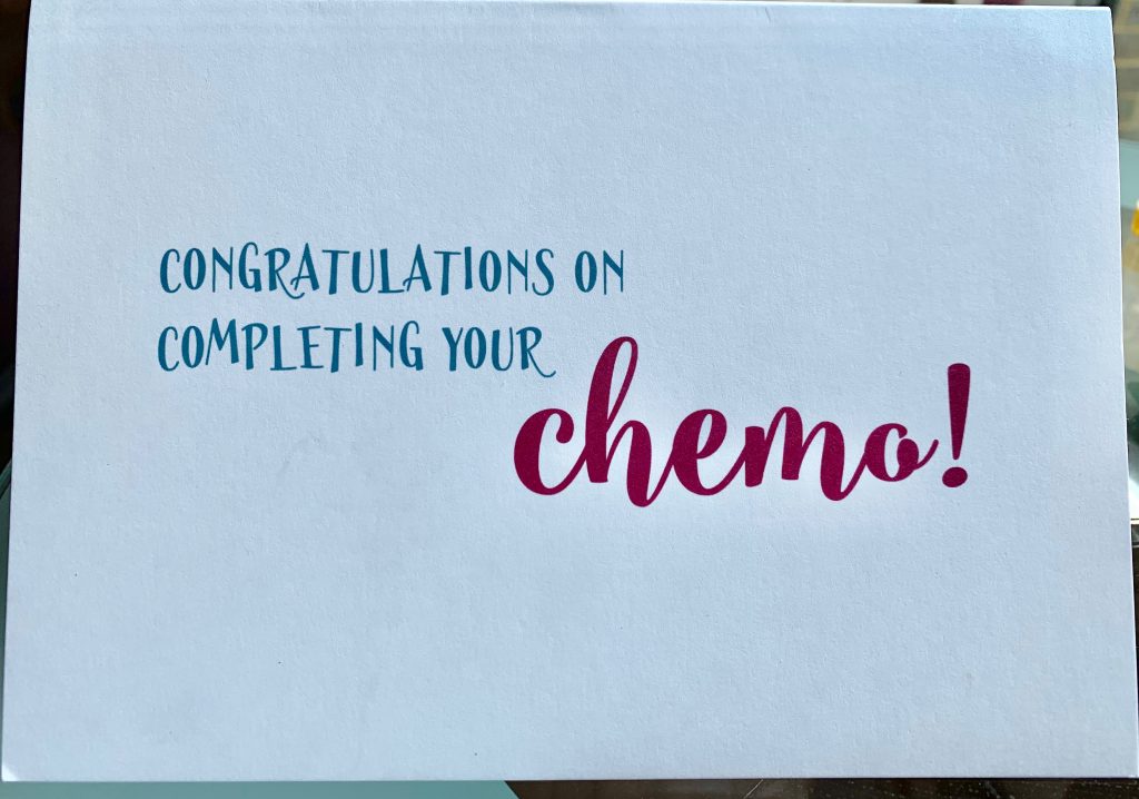 My final chemotherapy session was on 26th April and it was fairly routine – apart from the nurse having trouble accessing a vein; then on the second attempt bursting the vein as she took the needle out. To try and stop the leak of blood she kept rubbing over the area which hurt like mad and left me with a huge bruise. Then it all started again because they then discovered that two vials of blood were needed instead of the usual one!